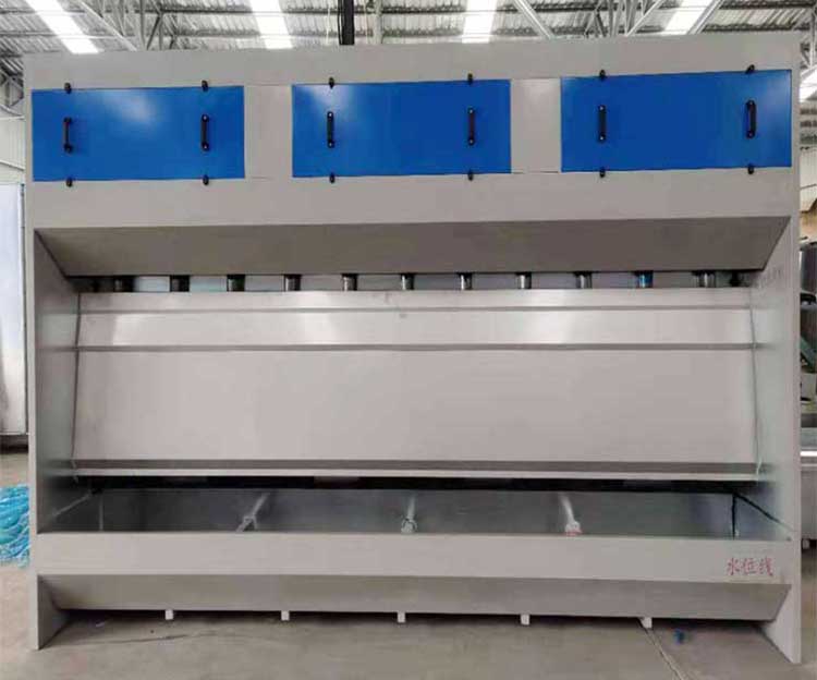 3米長水旋柜四、氣旋噴漆柜亦叫氣旋混動噴漆柜,氣旋混動噴漆水簾柜,氣旋水簾柜噴漆設備。氣旋噴漆柜作業時,粉塵或廢氣在負壓風機牽引力的作用下,噴漆噴膠產生一部分乳化性廢氣顆粒隨水簾落到水池中,大部分廢料進入高速旋流導軌裝置,漆霧、旋風與水在高速旋轉的進行氣液乳化反應。氣動混流裝置的高速運轉,使得漆霧與旋轉液體充分混合,在離心力的作用下達到漆液分離。氣旋桶內部采用水泵循環給水,由安裝在隔水層底部的螺旋噴嘴噴出來,漆霧分離出來的粉塵顆粒物下沉到水箱底部,分離后的氣體進入環保填充料隔水層,然后進入后段的廢氣處理設備。