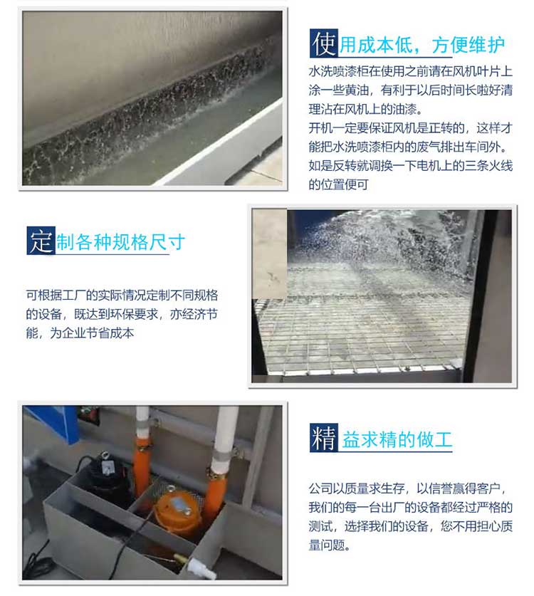 水簾柜是處理噴漆霧的一種廢氣處理設(shè)備。它的作業(yè)原理是將噴漆過程中噴槍噴出來的廢氣俗稱漆霧約束在必定的區(qū)域內(nèi)進(jìn)行過濾。再經(jīng)過吸水泵循環(huán)將水箱內(nèi)的水抽至上部水槽,由水槽溢流至水簾板,經(jīng)過水簾板構(gòu)成水簾 ,同時(shí)使用高速氣流所發(fā)生的沖擊效果,經(jīng)旋流板將水卷起來使水霧化來洗刷空氣,凈化漆霧,經(jīng)擋水板則將空氣中的水霧阻撓下來,處理后的空氣經(jīng)過風(fēng)機(jī)與排風(fēng)管道排出車間外面,能夠使操作者在契合國家衛(wèi)生條件和安全標(biāo)準(zhǔn)的作業(yè)環(huán)境中作業(yè),然后促進(jìn)企業(yè)出產(chǎn)功率更高。