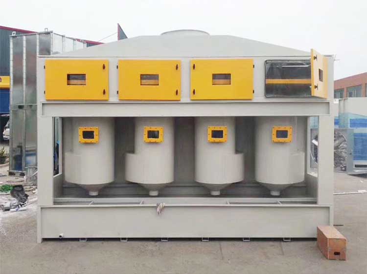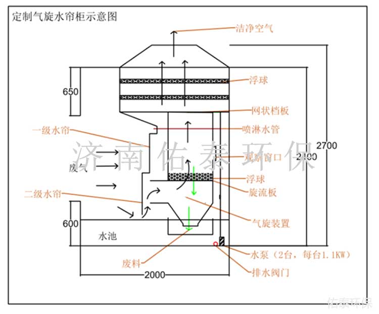 1、氣旋式噴漆水簾柜簡稱氣旋水簾柜,氣旋噴漆柜。該設(shè)備作業(yè)時,粉塵或廢氣在負(fù)壓風(fēng)機牽引力的作用下,噴漆噴膠產(chǎn)生一部分乳化性廢氣顆粒隨水簾落到水池中,大部分廢料進(jìn)入高速旋流導(dǎo)軌裝置,漆霧、旋風(fēng)與水在高速旋轉(zhuǎn)的進(jìn)行氣液乳化反應(yīng)。氣動混流裝置的高速運轉(zhuǎn),使得漆霧與旋轉(zhuǎn)液體充分混合,在離心力的作用下達(dá)到漆液分離。氣旋桶內(nèi)部采用水泵循環(huán)給水,由安裝在隔水層底部的螺旋噴嘴噴出來,漆霧分離出來的粉塵顆粒物下沉到水箱底部,分離后的氣體進(jìn)入環(huán)保填充料隔水層,然后進(jìn)入后段的廢氣處理設(shè)備。