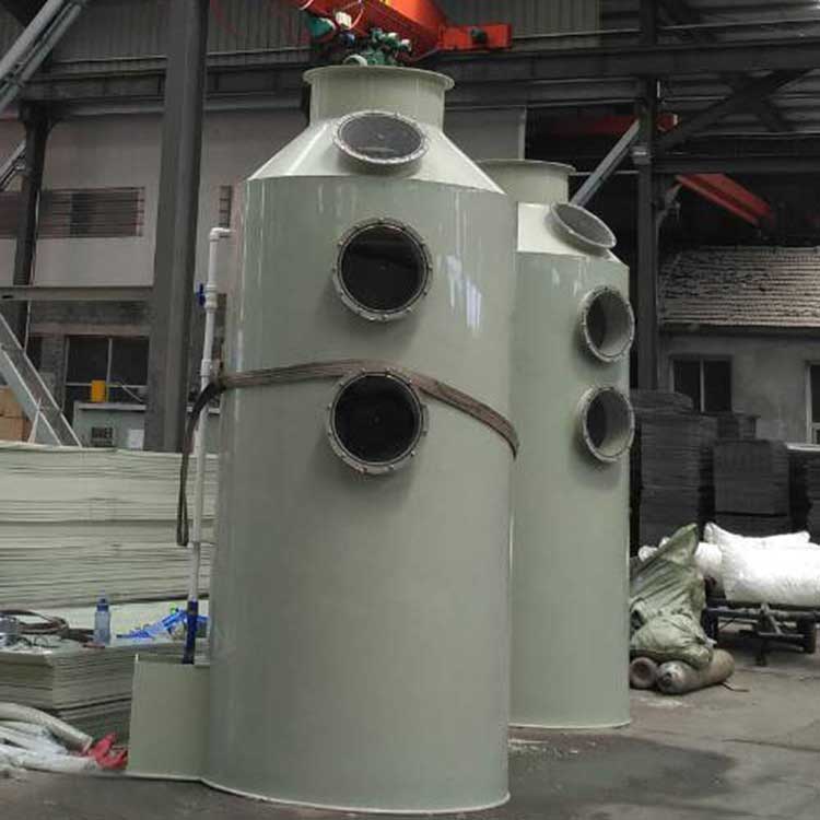 廢氣或粉塵通過洗滌塔下部入口進(jìn)入后,從下往上移動(dòng),遇到從上到下噴灑的水滴,煙氣與水進(jìn)行了熱交換,使煙氣溫度降低;同時(shí)煙氣中攜帶的塵埃被水滴潤(rùn)濕,小塵埃相互凝結(jié)成大塵埃,由于重力的作用,大塵埃離開煙氣流隨水一起流到洗滌塔下部,與煙氣一起被塔底水封提走。塔頂管道將冷卻和洗滌后的廢氣輸出。